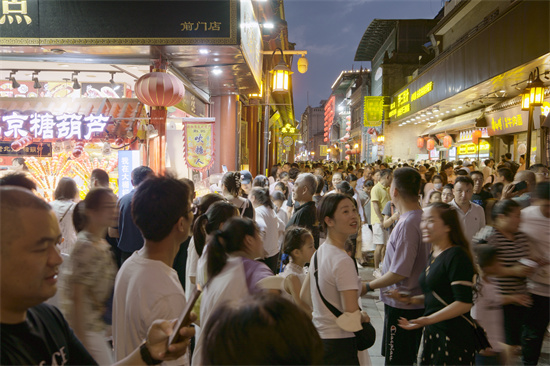 夜晚,前門大柵欄步行街人頭攢動(dòng)。街道兩旁,商鋪琳瑯滿目,夏季服飾、冷飲、小吃,透露出夏日的熱情與活力。