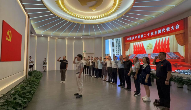 活動首站,商會一行人來到中共一大會址紀(jì)念館。珍貴的歷史文物、逼真的復(fù)原場景、翔實的文獻資料,全方位展現(xiàn)了中國共產(chǎn)黨誕生的歷史背景和艱辛歷程。黨員們跟隨著講解員的步伐,認(rèn)真聆聽每一個故事,端詳每一件展品。在宣誓廳,商會全體黨員面對黨旗,重溫入黨誓詞。誓言在大廳內(nèi)回蕩。