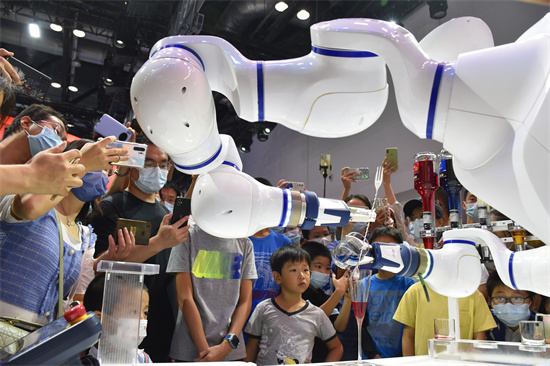 9月4日,在北京國家會(huì)議中心中國服務(wù)貿(mào)易成就展專區(qū),雙臂協(xié)作式機(jī)器人化身“調(diào)酒師”現(xiàn)場(chǎng)調(diào)酒。