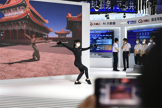 9月1日,參觀者在服貿(mào)會(huì)首鋼園展區(qū)拍攝由真人控制的虛擬數(shù)字人表演。