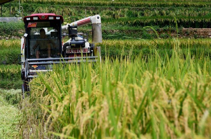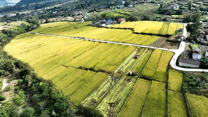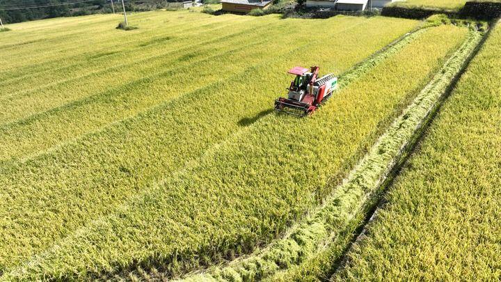 2024年9月11日,在涼山州會(huì)理市鹿廠鎮(zhèn)的水稻現(xiàn)代農(nóng)業(yè)園區(qū),農(nóng)業(yè)機(jī)械在收割稻谷。新華社記者 高健鈞 攝