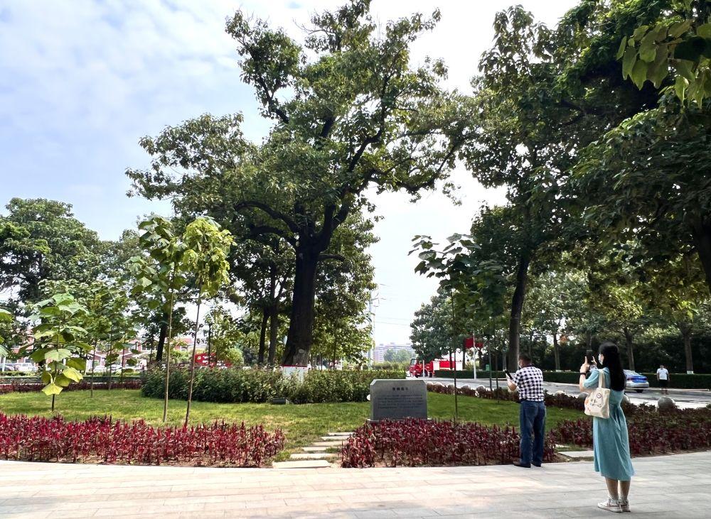 在河南省開封市蘭考縣焦裕祿干部學(xué)院門口,人們在“焦桐”下參觀(2022年8月15日攝)。新華社記者 郝源 攝
