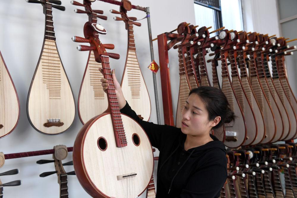 河南省開封市蘭考縣堌陽鎮(zhèn)徐場村村民孔釋漫在家庭樂器生產(chǎn)作坊工作(2024年4月17日攝)。新華社記者 朱祥 攝