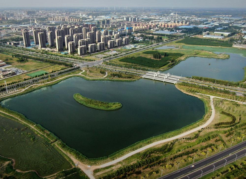 這是2021年6月23日拍攝的河南省開封市蘭考縣鳳鳴湖濕地公園(無人機照片)。新華社記者 李安 攝