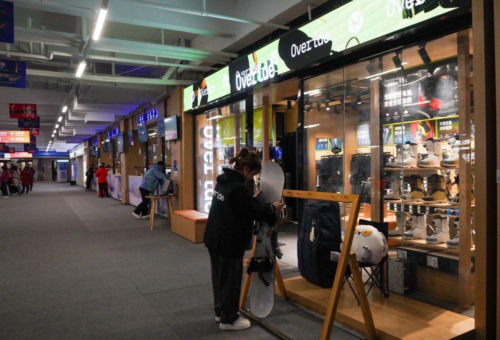 11月15日,在吉林北大湖滑雪度假區(qū)商業(yè)街內(nèi)的一家國(guó)產(chǎn)品牌雪具店,工作人員在擺放雪板。新華社記者 顏麟蘊(yùn) 攝