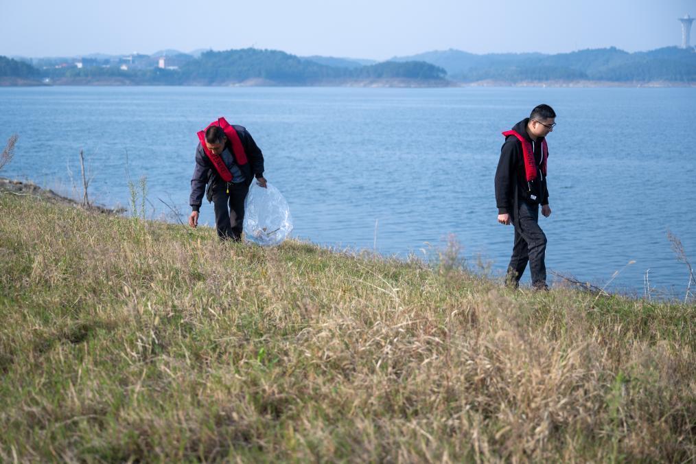 2024年10月25日,清漂隊(duì)隊(duì)員在丹江口水庫(kù)一個(gè)小島上清理垃圾。新華社記者 杜子璇 攝