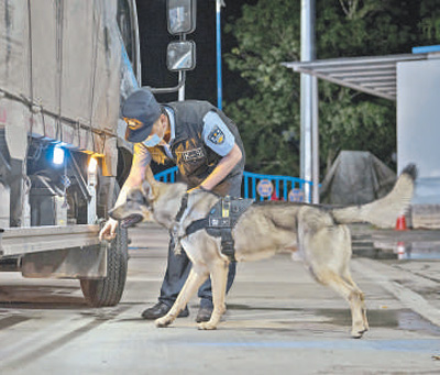西雙版納邊境管理支隊(duì)大開(kāi)河邊境檢查站移民管理警察攜帶警犬查驗(yàn)貨車(chē)。曾玉祥 畢小懿攝影報(bào)道