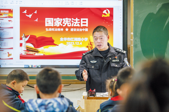2023年12月4日是第十個國家憲法日。當天,金華市各地開展形式多樣的憲法普法教育宣傳活動,普及憲法知識,弘揚憲法精神,增強全民憲法意識。圖為金華市婺城區(qū)紅湖路小學教室里,該校法制副校長金忠清給學生講解憲法知識。