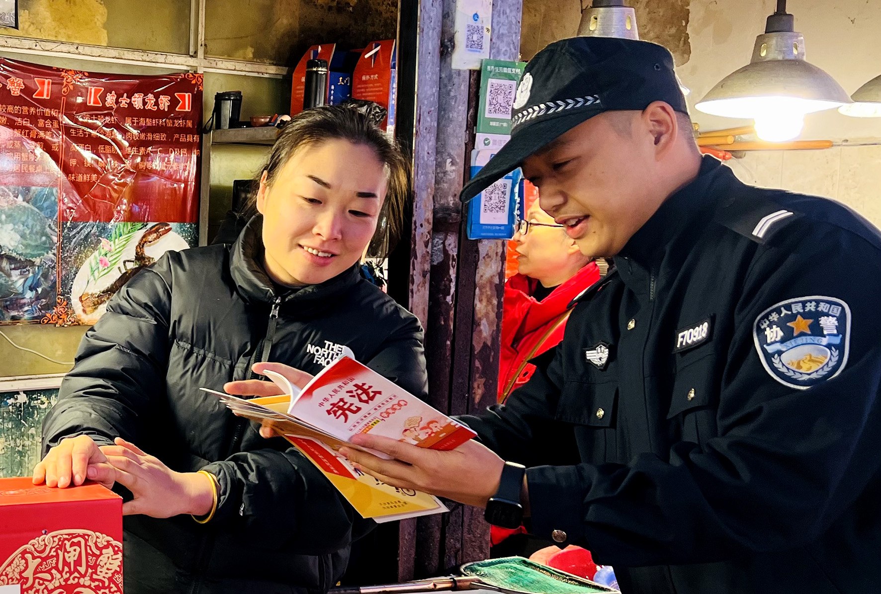 12月4日,浙江省臺(tái)州市天臺(tái)縣公安局民輔警走進(jìn)農(nóng)貿(mào)市場(chǎng)開(kāi)展憲法宣傳活動(dòng)。