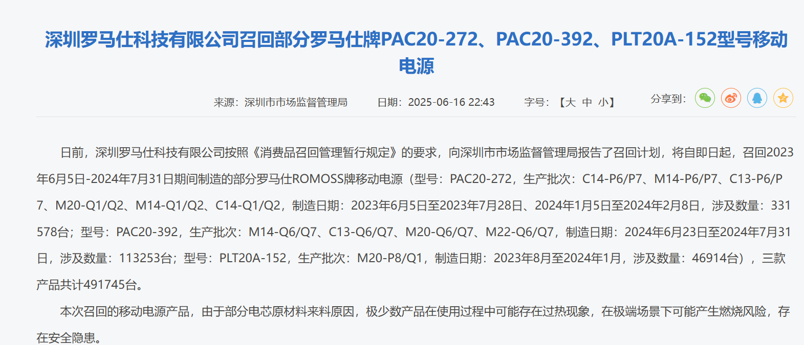 6月16日晚間,深圳市市場監(jiān)督管理局網(wǎng)站披露,日前,深圳羅馬仕科技有限公司按照《消費品召回管理暫行規(guī)定》的要求,向深圳市市場監(jiān)督管理局報告了召回計劃,將自即日起召回2023年6月5日—2024年7月31日期間制造的部分羅馬仕ROMOSS牌移動電源,三款產(chǎn)品共計491745臺。